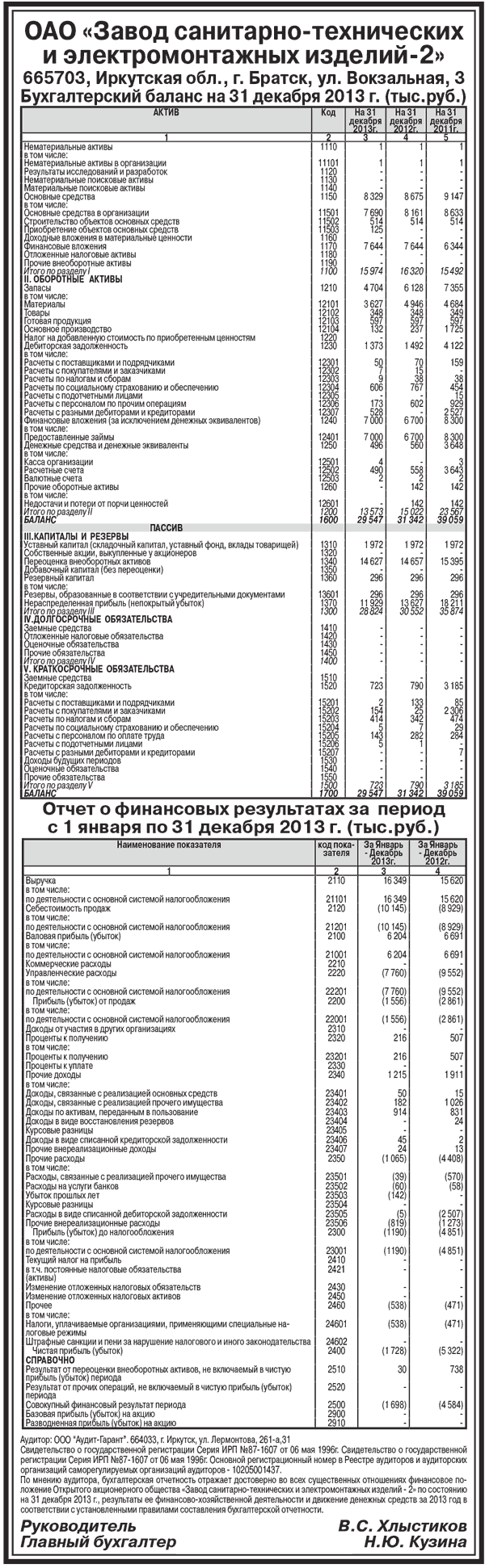 ОАО «Завод санитарно-технических и электромонтажных изделий-2». Бухгалтерский баланс на 31 декабря 2013 г. (тыс.руб.)