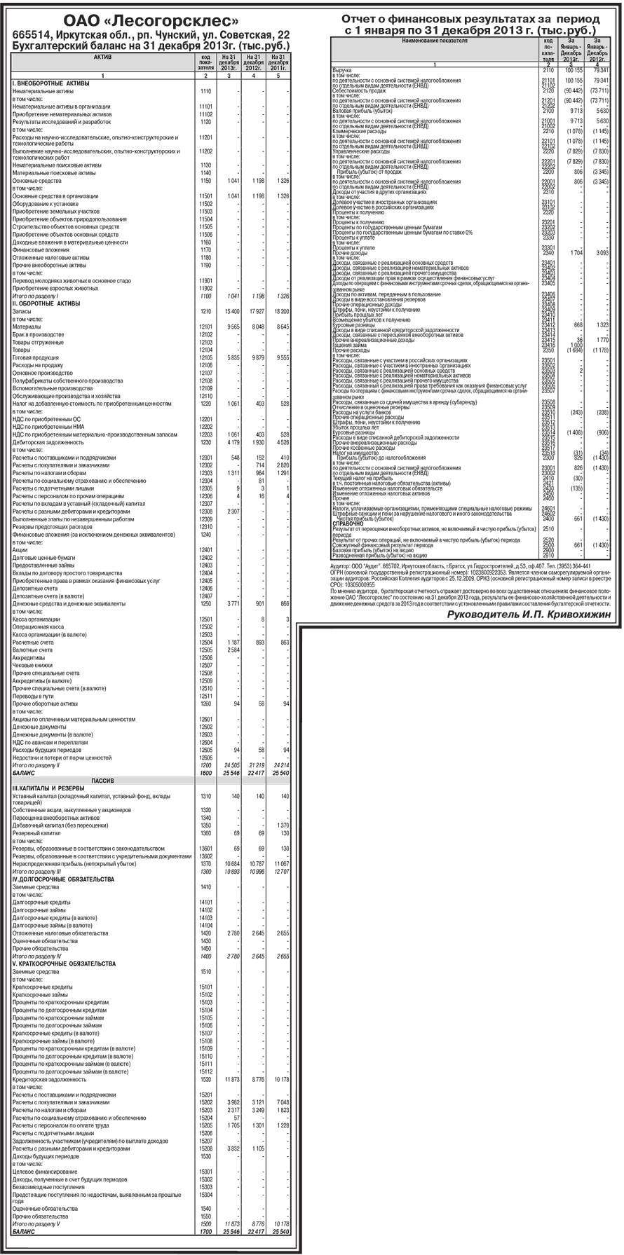 ОАО «Лесогорсклес». Бухгалтерский баланс на 31 декабря 2013г. (тыс.руб.)