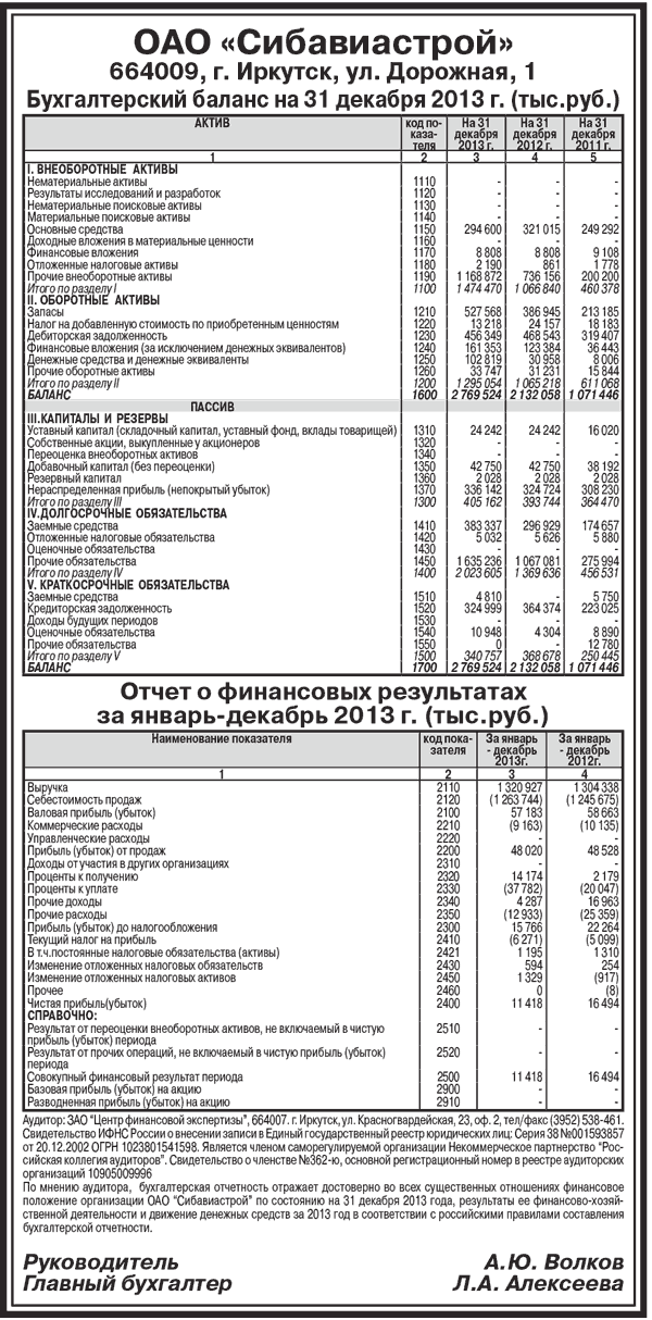 ОАО «Сибавиастрой». Бухгалтерский баланс на 31 декабря 2013 г. (тыс.руб.)
