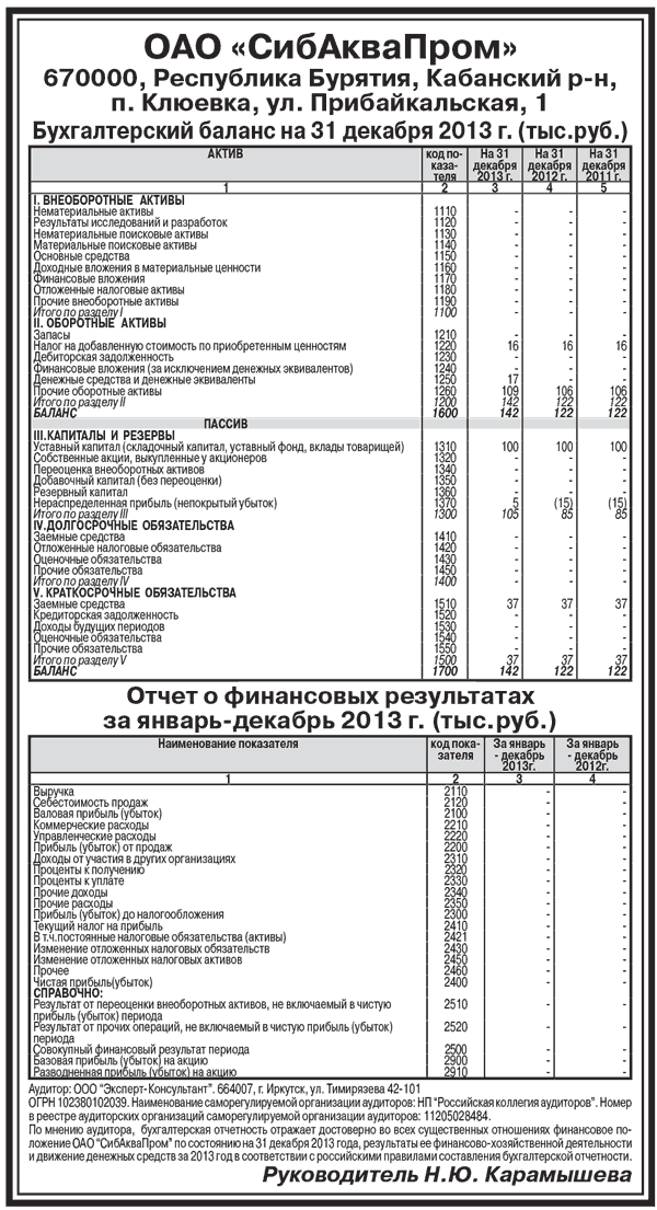 ОАО «СибАкваПром». Бухгалтерский баланс на 31 декабря 2013 г. (тыс.руб.)
