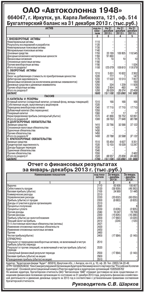 ОАО «Автоколонна 1948». Бухгалтерский баланс на 31 декабря 2013 г. (тыс.руб.)
