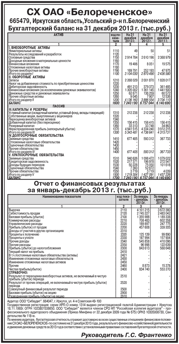 СХ ОАО «Белореченское». Бухгалтерский баланс на 31 декабря 2013 г. (тыс.руб.)