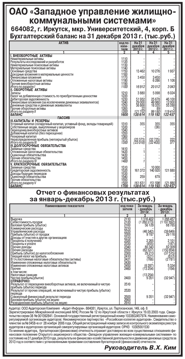 ОАО «Западное управление жилищно-коммунальными системами». Бухгалтерский баланс на 31 декабря 2013 г. (тыс.руб.)