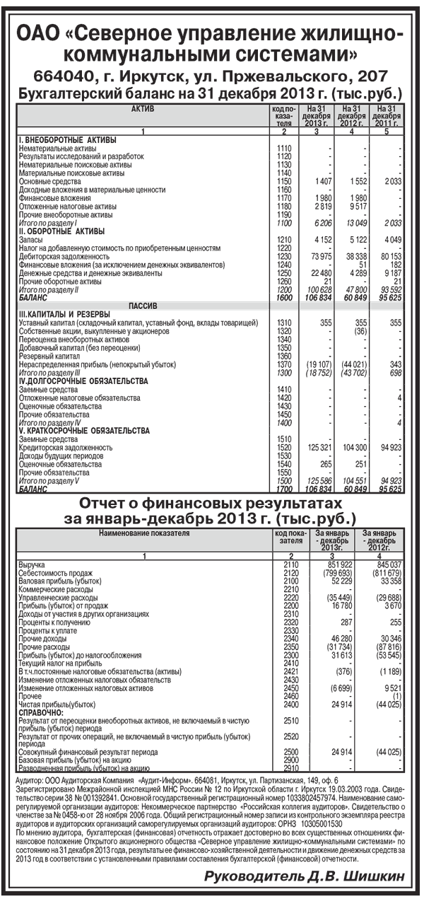 ОАО «Северное управление жилищно-коммунальными системами». Бухгалтерский баланс на 31 декабря 2013 г. (тыс.руб.)