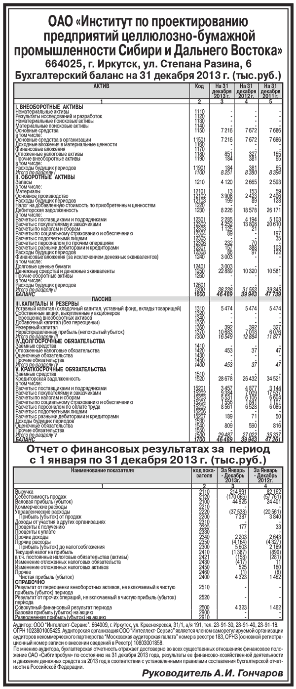 ОАО «Институт по проектированию предприятий целлюлозно-бумажной промышленности Сибири и Дальнего Востока». Бухгалтерский баланс на 31 декабря 2013 г. (тыс.руб.)