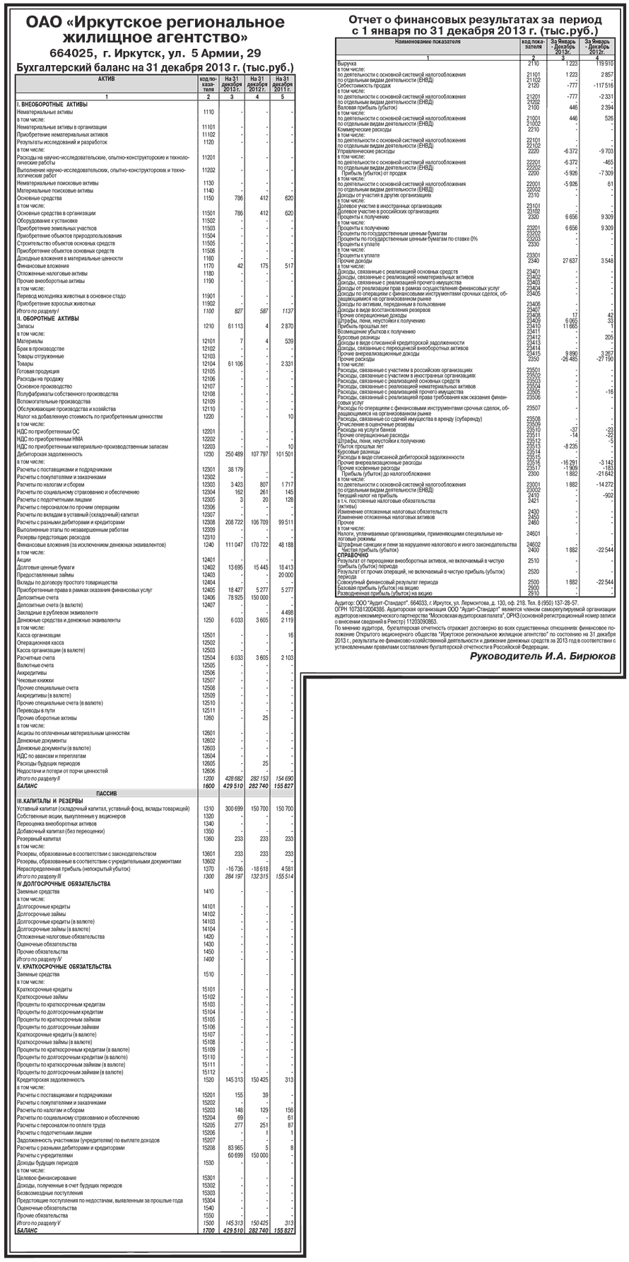 ОАО «Иркутское региональное жилищное агентство». Бухгалтерский баланс на 31 декабря 2013 г. (тыс.руб.)