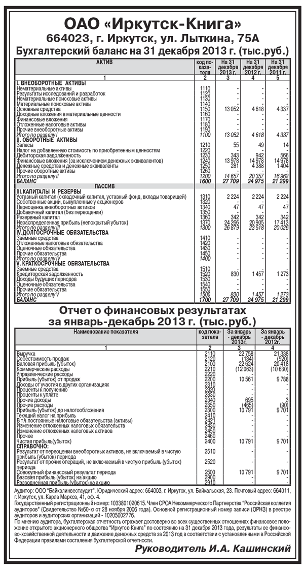 ОАО «Иркутск-Книга». Бухгалтерский баланс на 31 декабря 2013 г. (тыс.руб.)