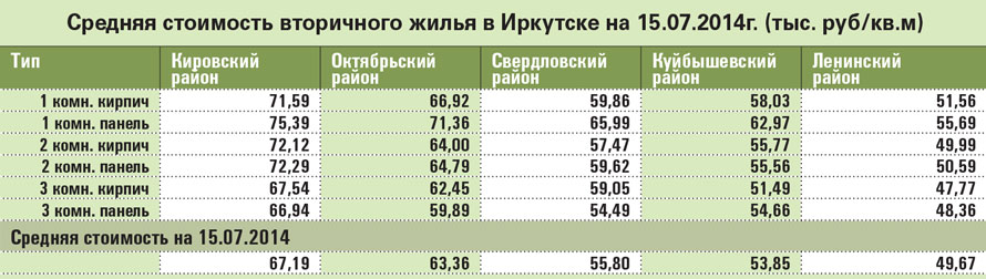 Средняя стоимость вторичного жилья в Иркутске на 15.07.2014г. (тыс.руб/кв.м) по данным REALTY.IRK.RU