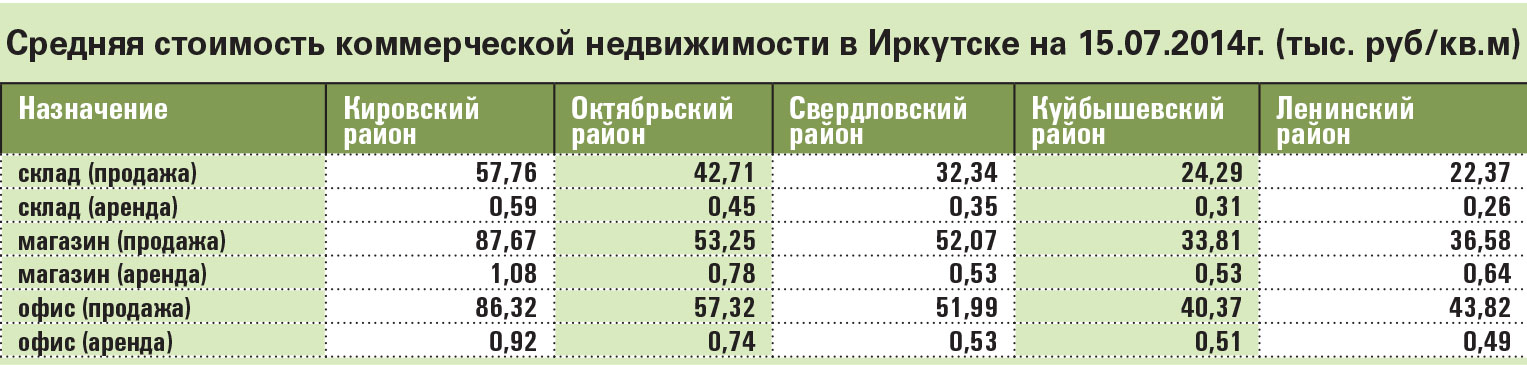 Средняя стоимость коммерческой недвижимости в Иркутске на 15.07.2014г. (тыс.руб/кв.м) по данным REALTY.IRK.RU