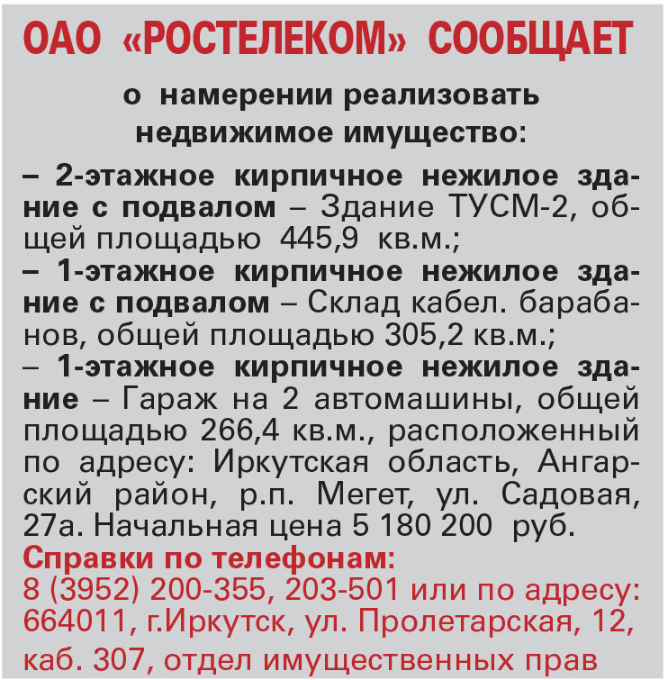 ОАО «РОСТЕЛЕКОМ» сообщает о намерении реализовать недвижимое имущество