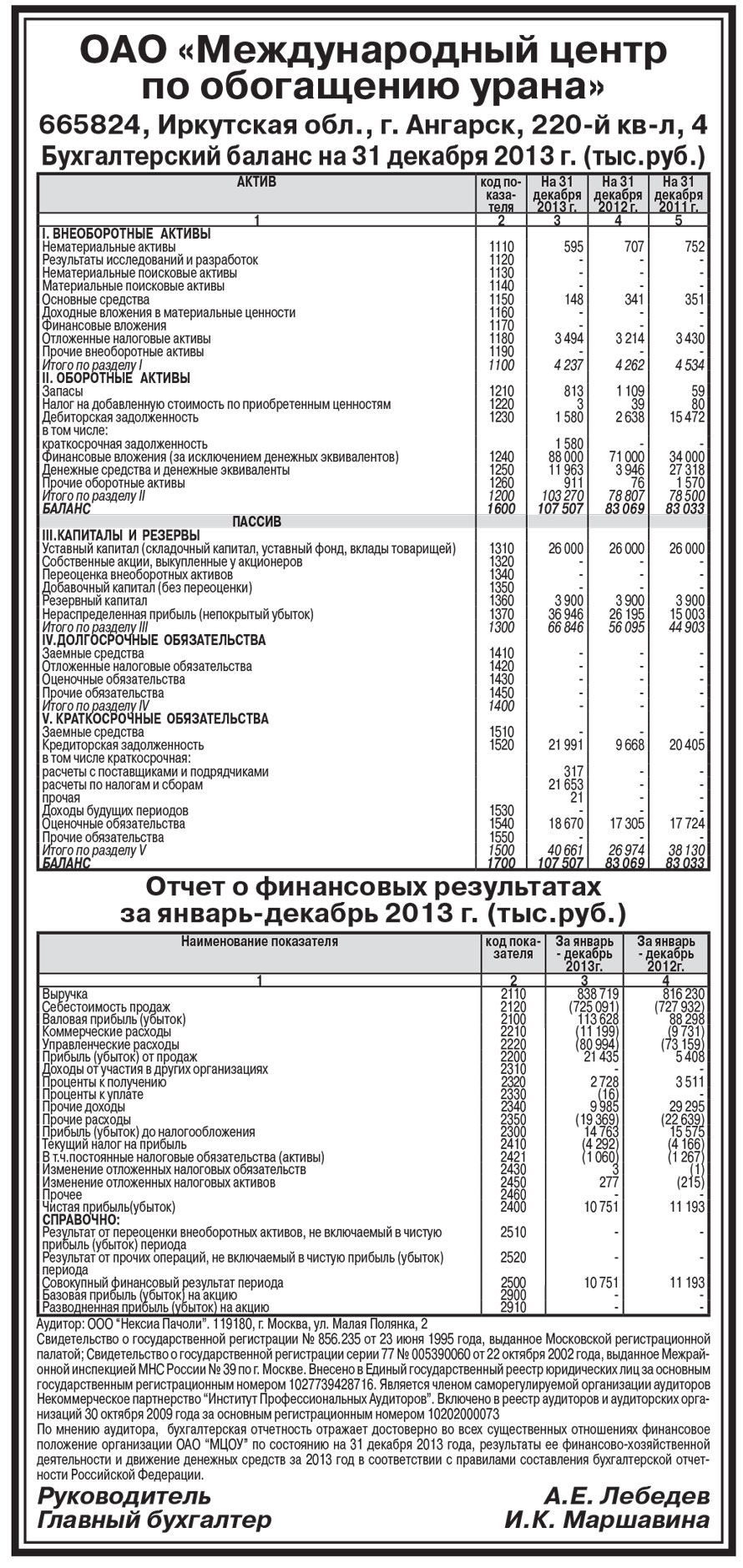 ОАО «Международный центр по обогащению урана». Бухгалтерский баланс на 31 декабря 2013 г. (тыс.руб.)