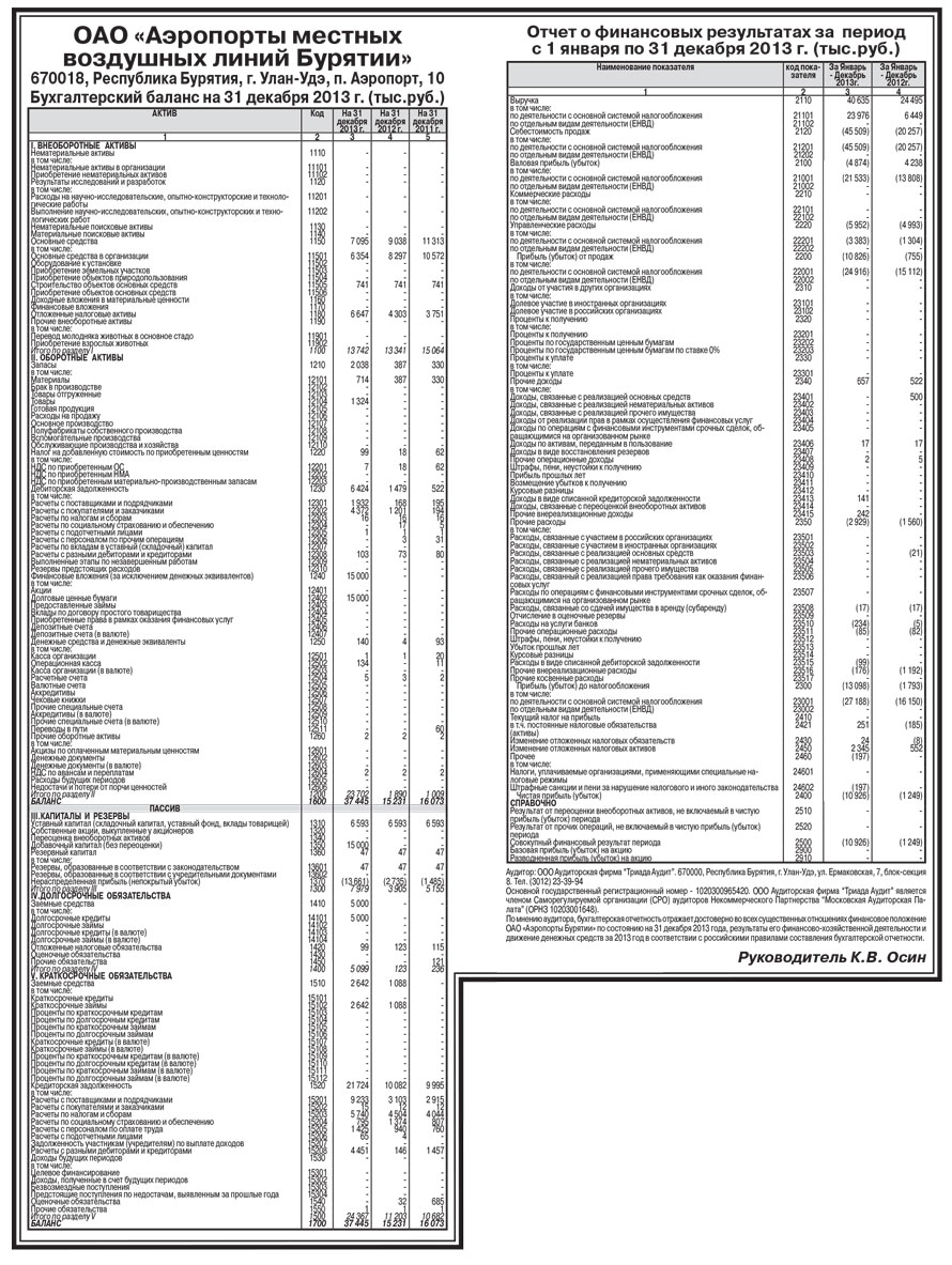 ОАО «Аэропорты местных воздушных линий Бурятии». Бухгалтерский баланс на 31 декабря 2013 г. (тыс.руб.)