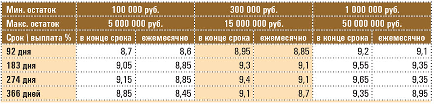 *Депозит «Оперативный плюс» для юридических лиц и индивидуальных предпринимателей, относящихся к сегменту малого бизнеса. Максимальные ставки (в процентах годовых) в рублях с возможностью пополнения и снятия (частичное снятие возможно не ранее, чем через 30 дней со дня первого внесения средств на счет по вкладу (депозиту)).