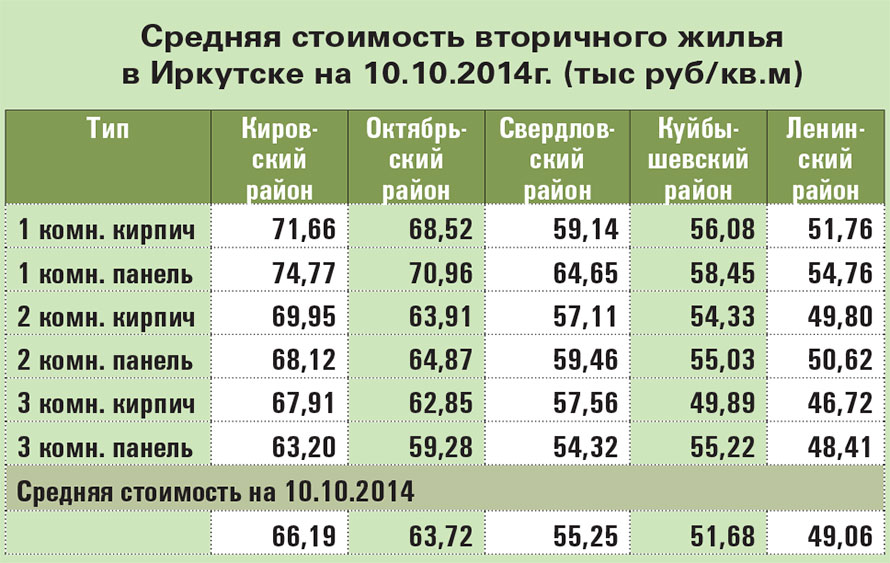 Средняя стоимость вторичного жилья в Иркутске на 10.10.2014г. (тыс руб/кв.м) по данным REALTY.IRK.RU