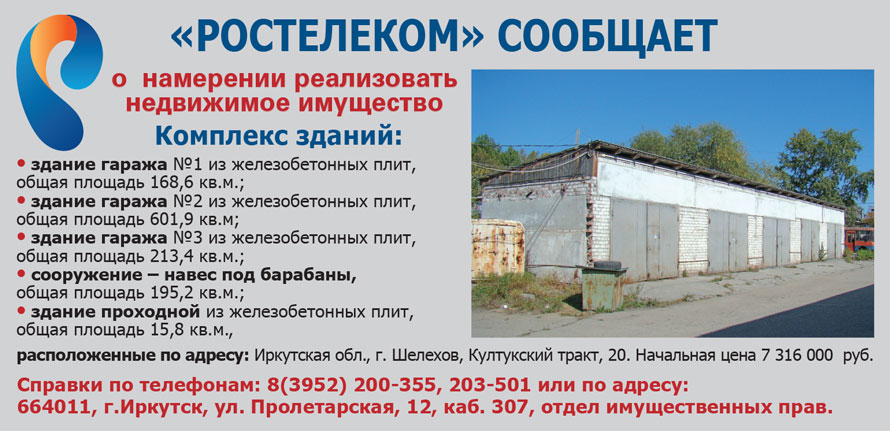«РОСТЕЛЕКОМ» СООБЩАЕТ о намерении реализовать комплекс зданий расположенный по адресу: Иркутская обл., г. Шелехов, Култукский тракт, 20