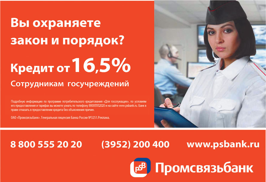 Вы охраняете закон и порядок? Промсвязьбанк предлагает кредиты сотрудникам госучреждений от 16,5%