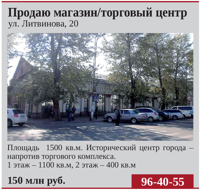 Продается магазин по ул.Литвинова, 20. Исторический центр города Иркутска. Напротив торговый комплекс
