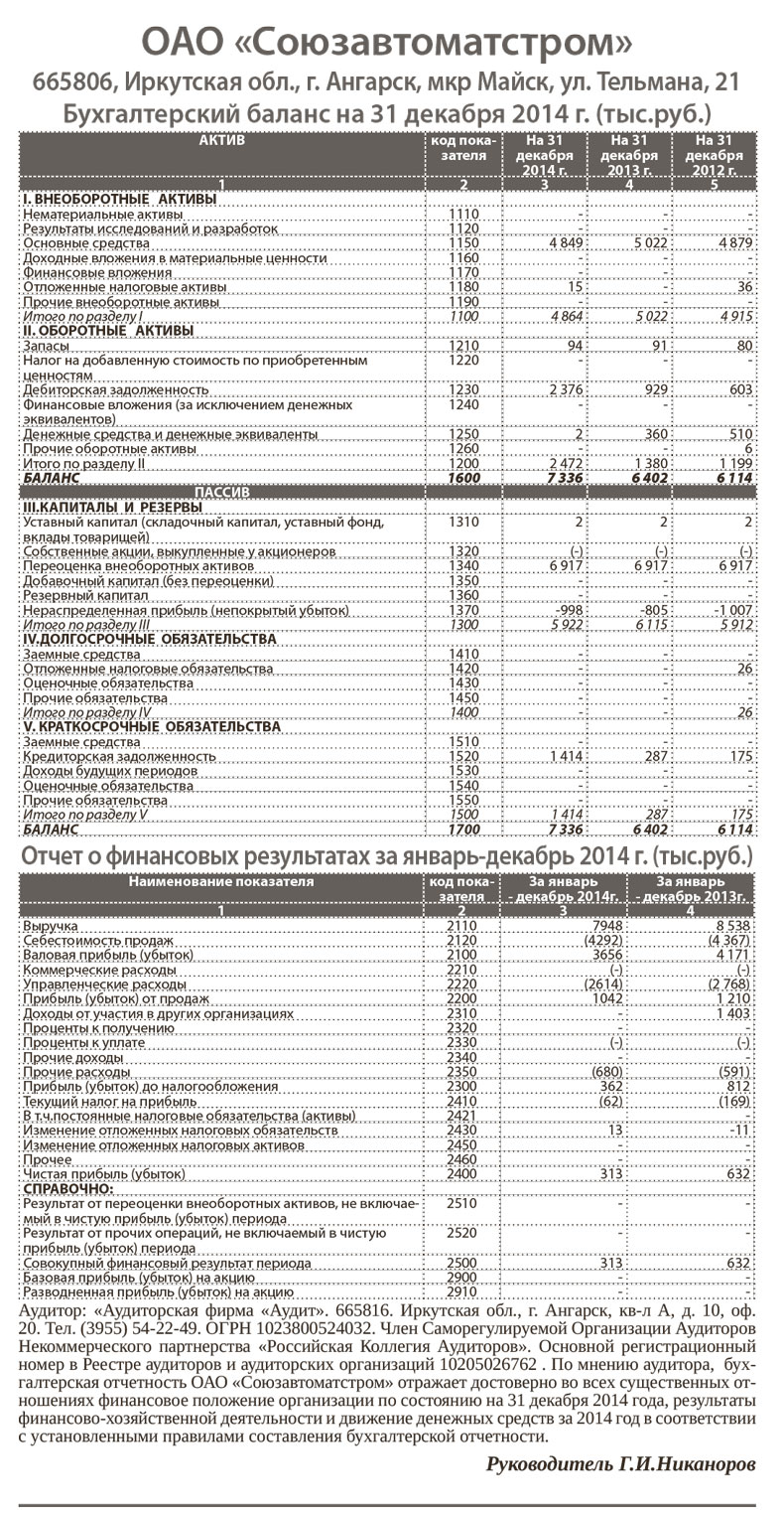 Бухгалтерский баланс ОАО «Союзавтоматстром» на 31 декабря 2014 г.
