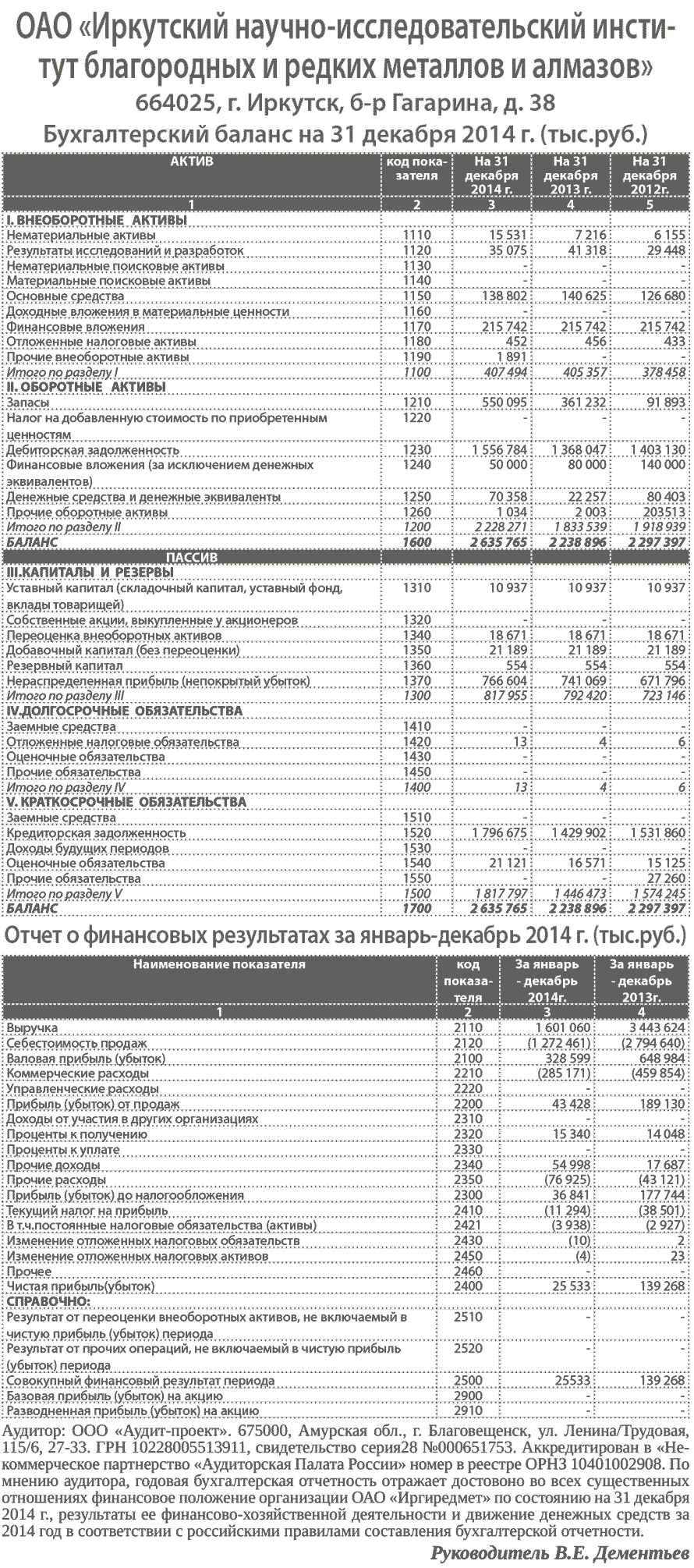 Бухгалтерский баланс ОАО «Иркутский научно-исследовательский институт благородных и редких металлов и алмазов» на 31 декабря 2014 г.