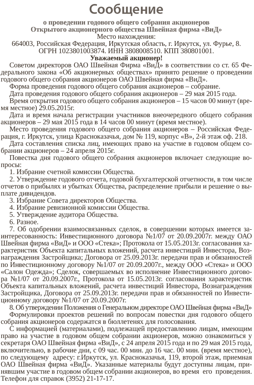 Сообщение о проведении годового общего собрания акционеров ОАО Швейная фирма «ВиД»