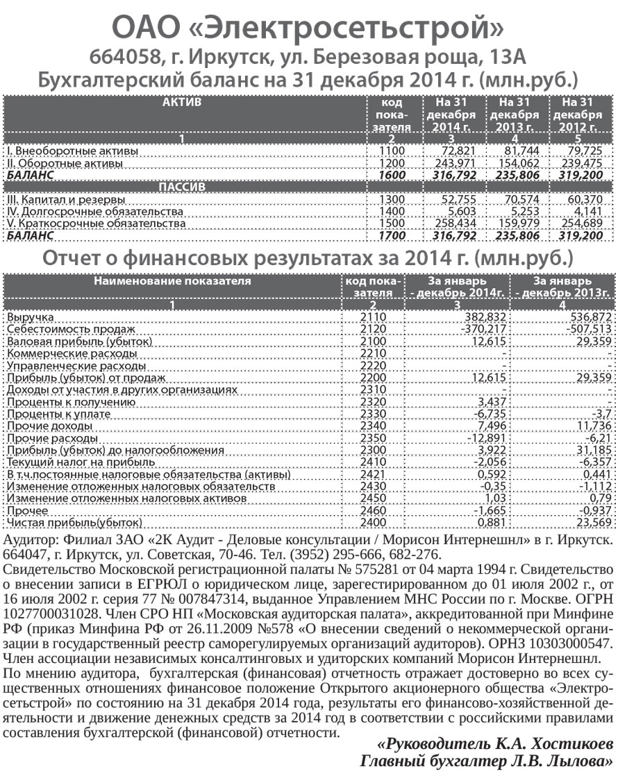 ОАО «Электросетьстрой». Бухгалтерский баланс на 31 декабря 2014 г. (млн.руб.)