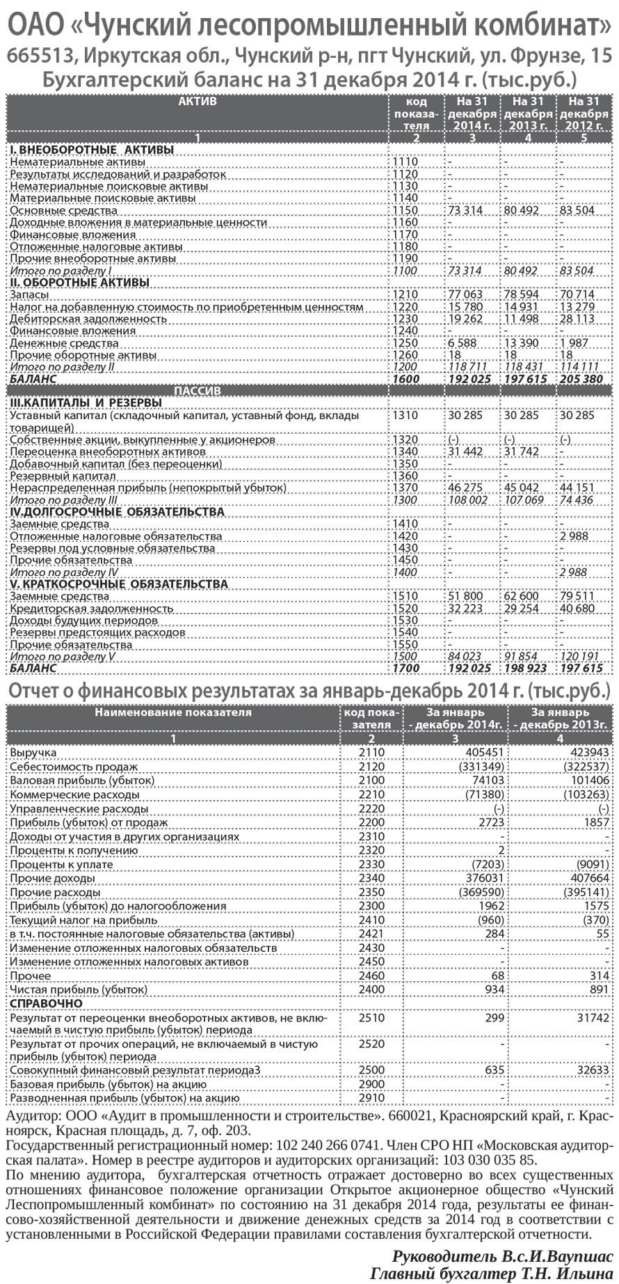 ОАО «Чунский лесопромышленный комбинат». Бухгалтерский баланс на 31 декабря 2014 г. (тыс.руб.)