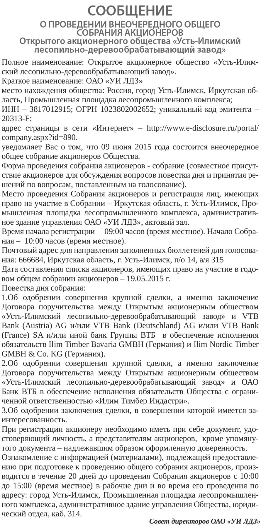СООБЩЕНИЕ О ПРОВЕДЕНИИ ВНЕОЧЕРЕДНОГО ОБЩЕГО СОБРАНИЯ АКЦИОНЕРОВ Открытого акционерного общества «Усть-Илимский лесопильно-деревообрабатывающий завод»