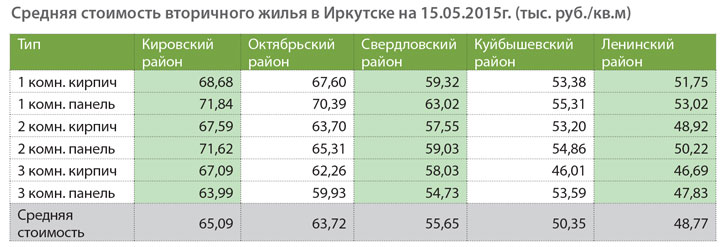 Средняя стоимость вторичного жилья в Иркутске на 15.05.2015г. (тыс. руб./кв.м)
