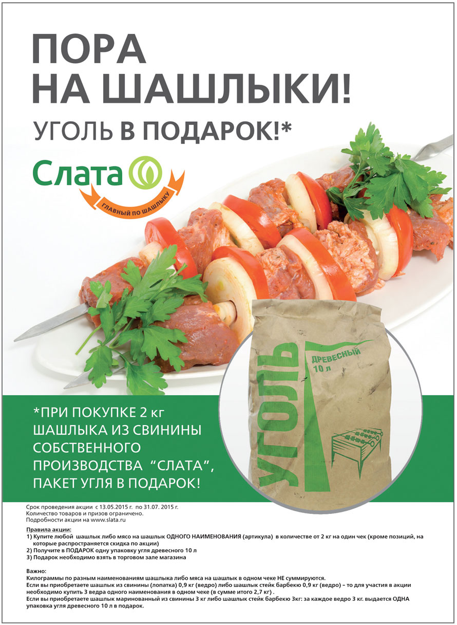 При покупке 2 кг шашлыка из свинины собственного производства «СЛАТА» - пакет угля в подарок!