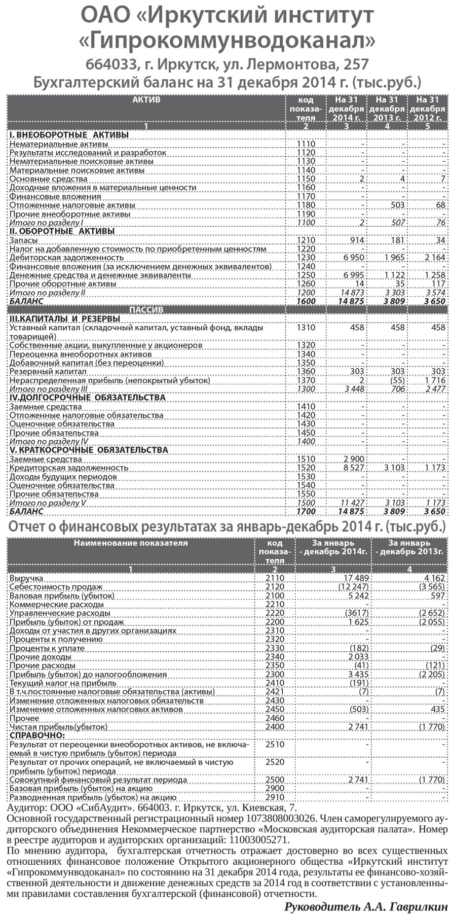 ОАО «Иркутский институт «Гипрокоммунводоканал». Бухгалтерский баланс на 31 декабря 2014 г. (тыс.руб.)