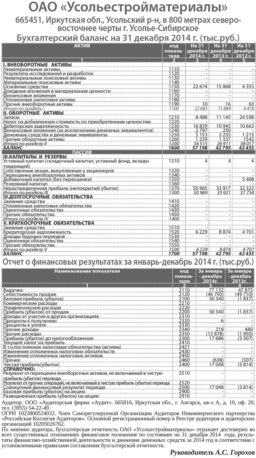 ОАО «Усольестройматериалы». Бухгалтерский баланс на 31 декабря 2014 г. (тыс.руб.)
