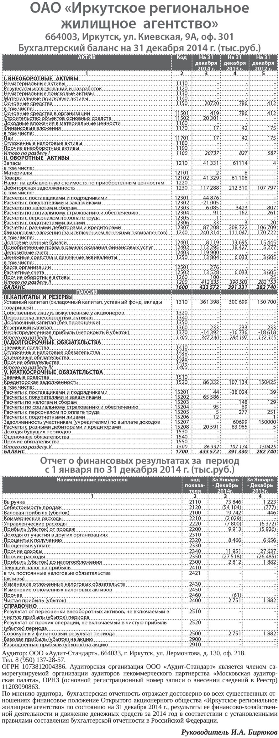 ОАО «Иркутское региональное жилищное агентство» Бухгалтерский баланс на 31 декабря 2014 г. (тыс.руб.)