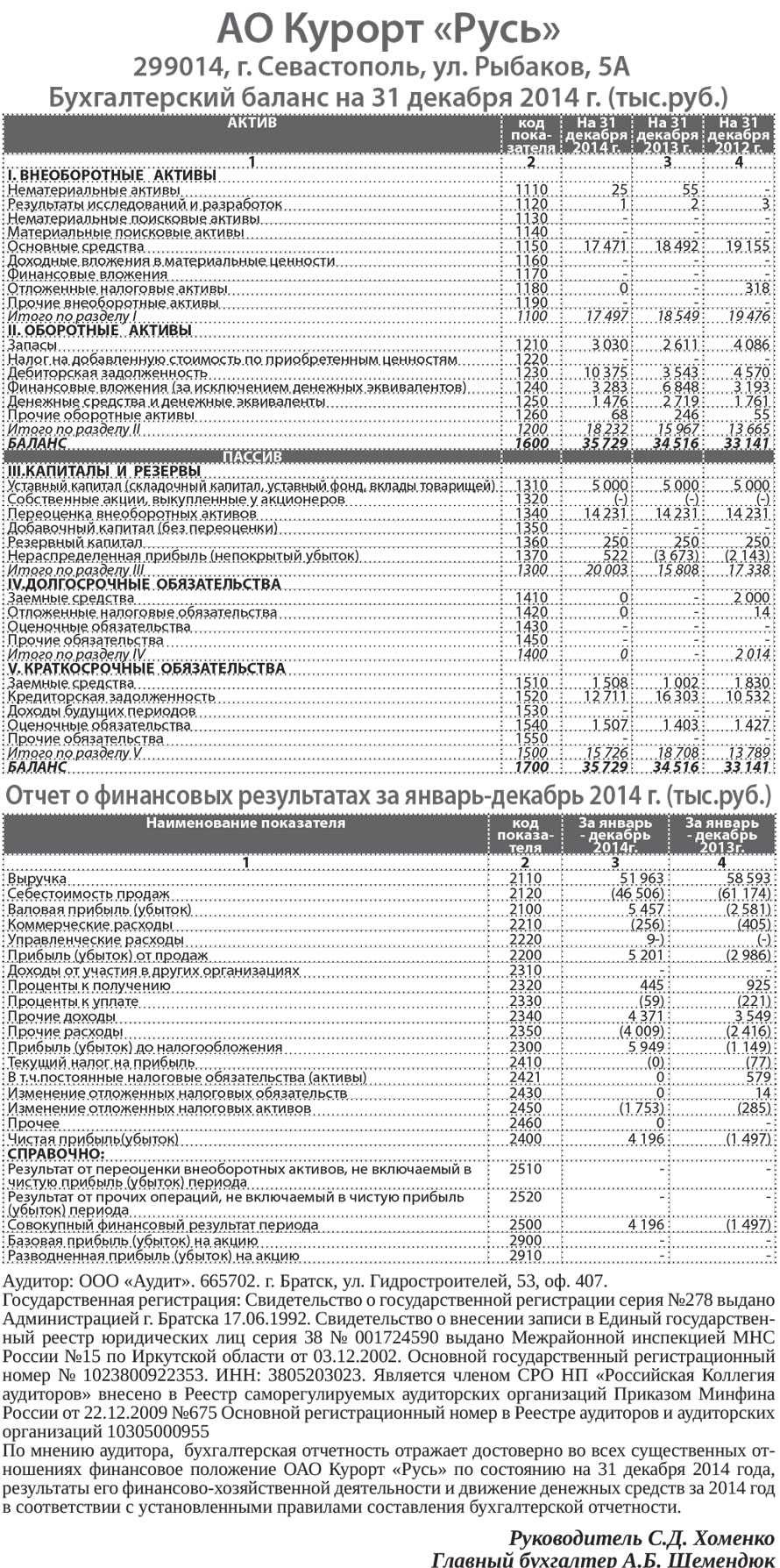 АО Курорт «Русь» Бухгалтерский баланс на 31 декабря 2014 г. (тыс.руб.)