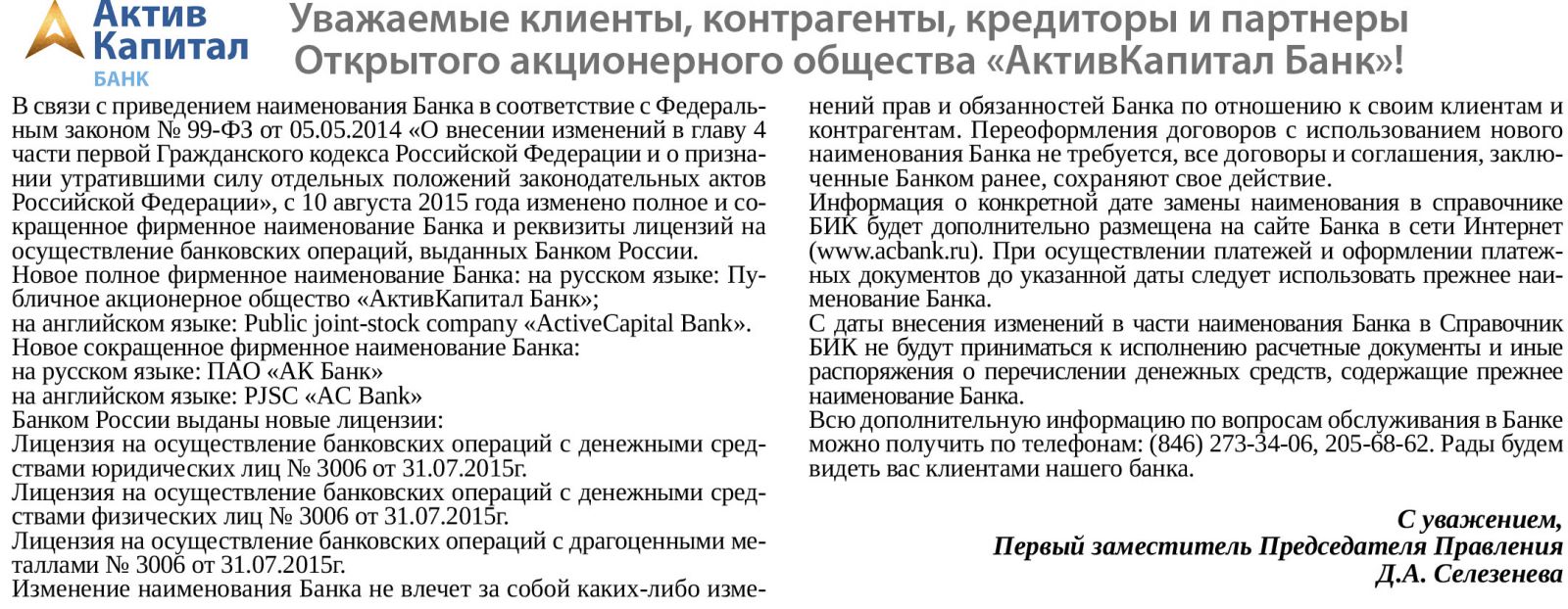Уважаемые клиенты, контрагенты, кредиторы и партнеры Открытого акционерного общества «АктивКапитал Банк»!