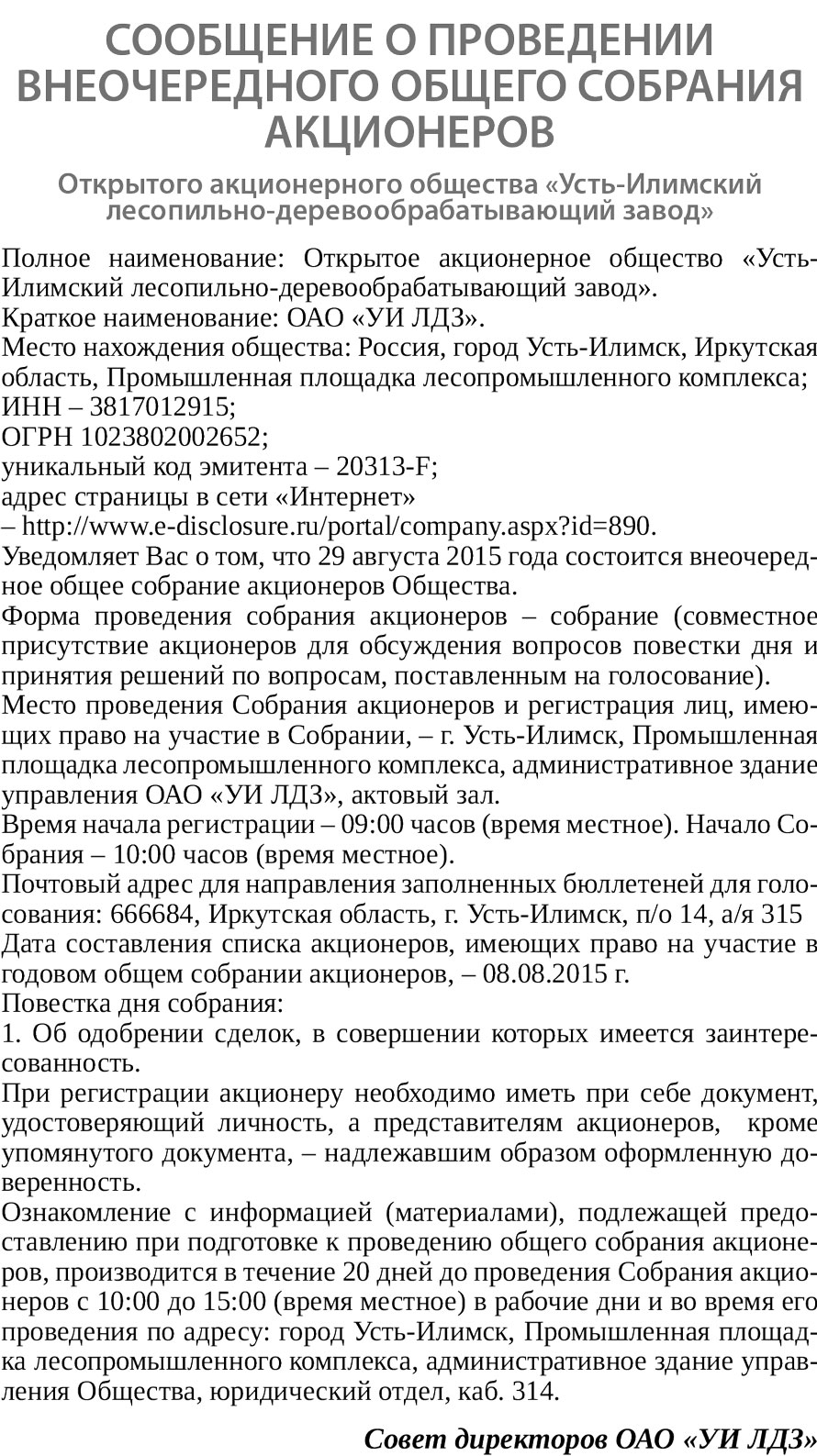 Сообщение о проведении внеочередного общего собрания акционеров Открытого акционерного общества «Усть-Илимский лесопильно-деревообрабатывающий завод»