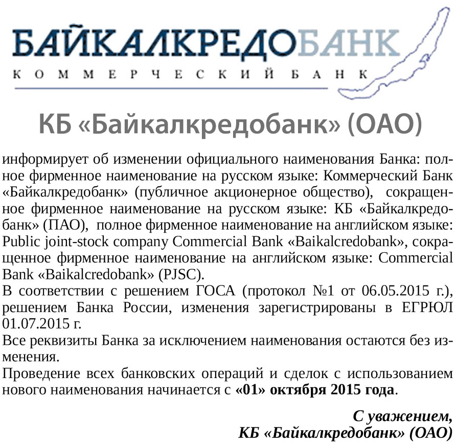 КБ «Байкалкредобанк» (ОАО) информирует об изменении официального наименования Банка