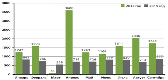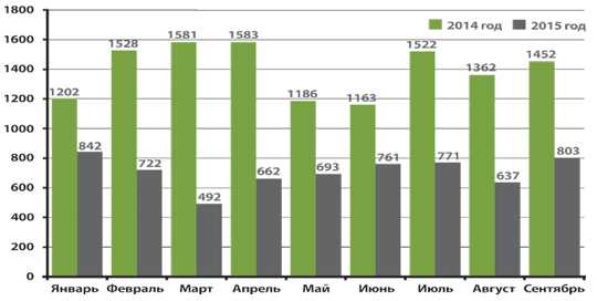 Больше всего договоров долевого участия в Иркутске было зарегистрировано в январе – 842 (во многом это было продолжением «ажиотажного» декабря 2014 года). Лидером в целом по региону стал сентябрь – в этом месяце в Приангарье было зарегистрировано 877 ДДУ.