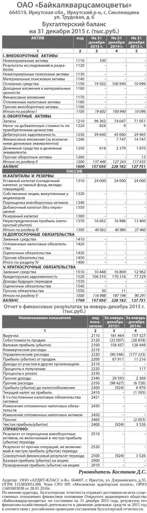 ОАО «Байкалкварцсамоцветы». Бухгалтерский баланс на 31 декабря 2015 г. (тыс.руб.)