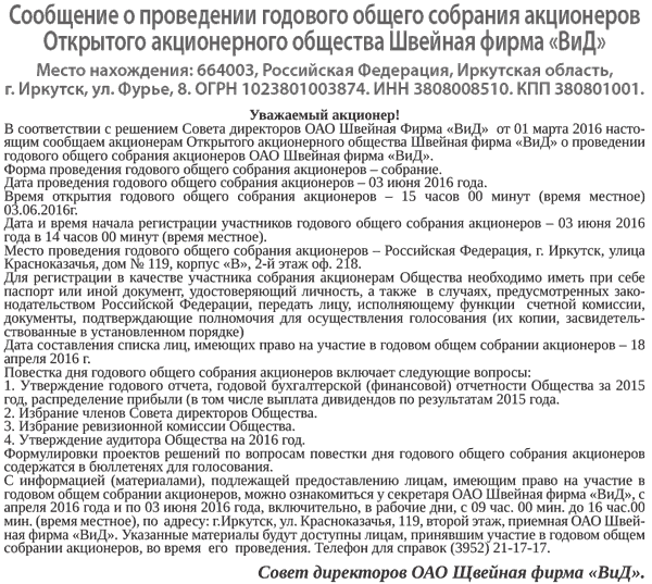 Сообщение о проведении годового общего собрания акционеров Открытого акционерного общества Швейная фирма «ВиД»
