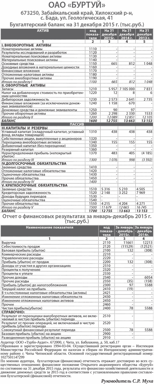 ОАО «БУРТУЙ». Бухгалтерский баланс на 31 декабря 2015 г. (тыс.руб.)
