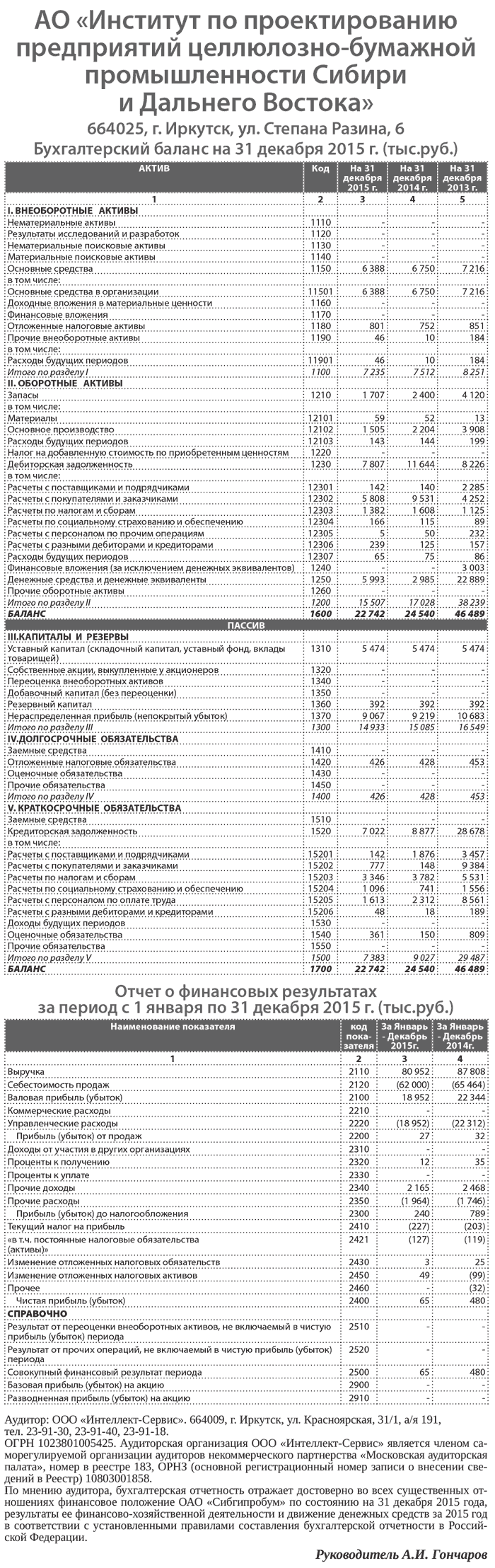 АО «Институт по проектированию предприятий целлюлозно-бумажной промышленности Сибири и Дальнего Востока». Бухгалтерский баланс на 31 декабря 2015 г. (тыс.руб.)