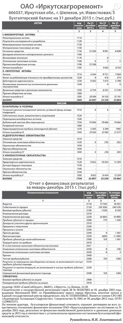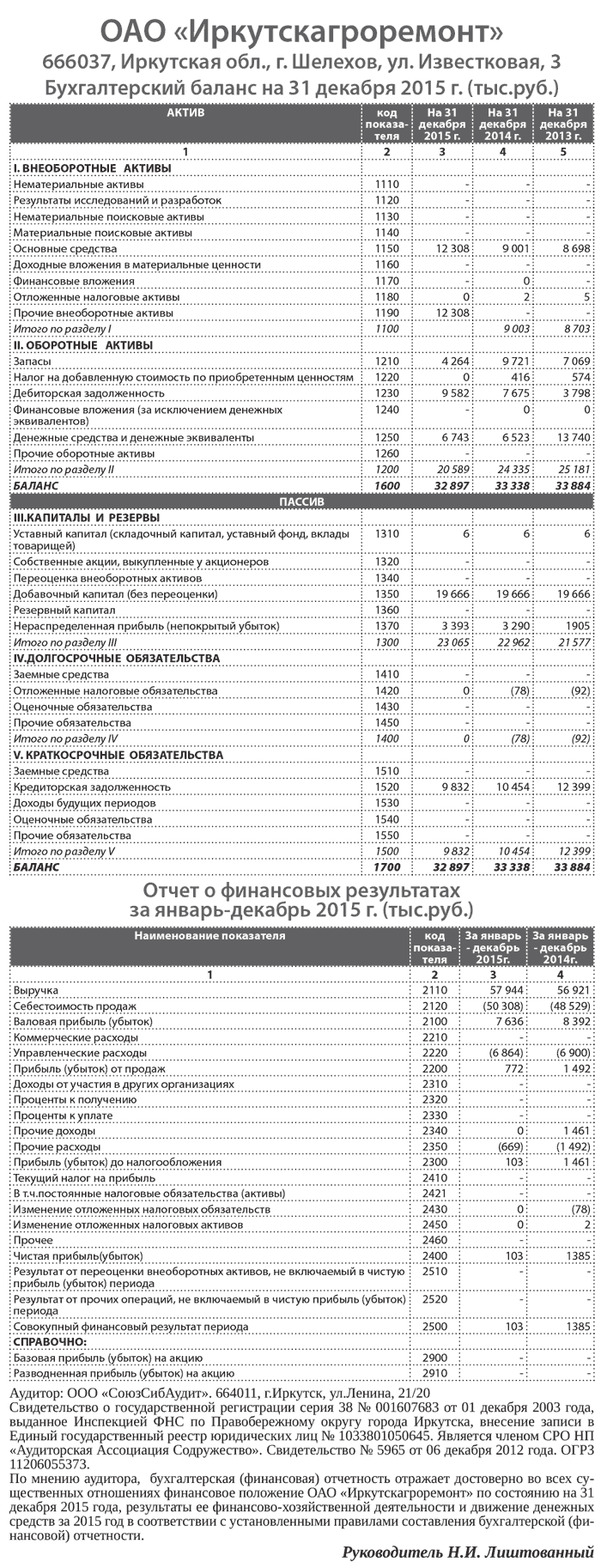 ОАО «Иркутскагроремонт». Бухгалтерский баланс на 31 декабря 2015 г. (тыс.руб.)
