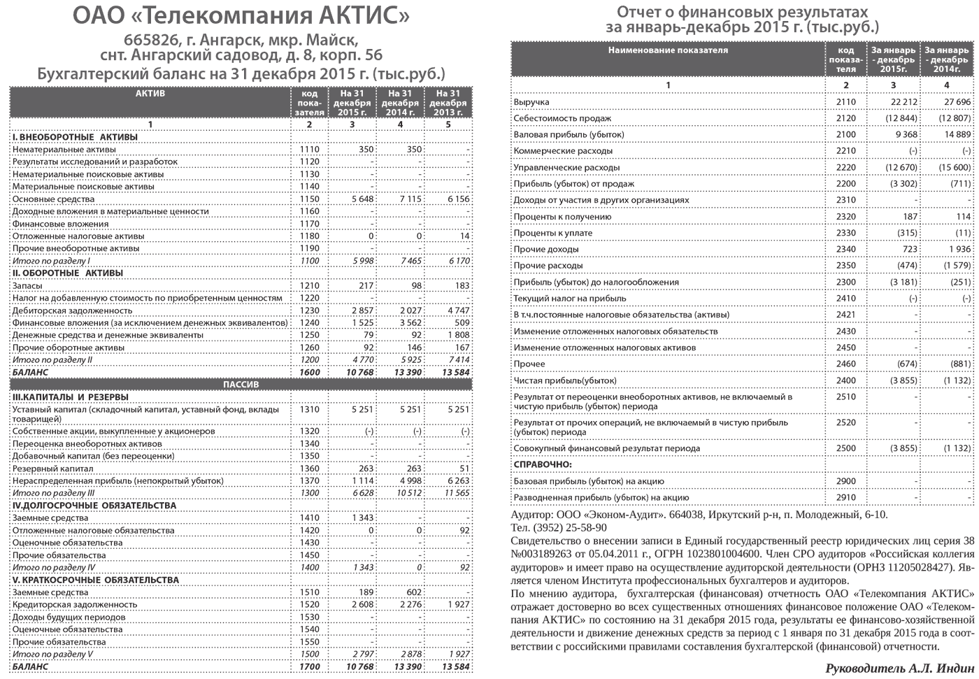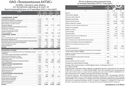 ОАО «Телекомпания АКТИС». Бухгалтерский баланс на 31 декабря 2015 г. (тыс.руб.)