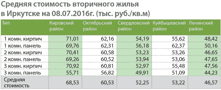 Средняя стоимость вторичного жилья в Иркутске на 08.07.2016г. (тыс. руб./кв.м)