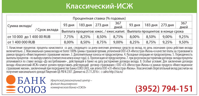ВКЛАД МЕСЯЦА! Классический-ИСЖ от Иркутский региональный центр – филиал Акционерного коммерческого банка «СОЮЗ»