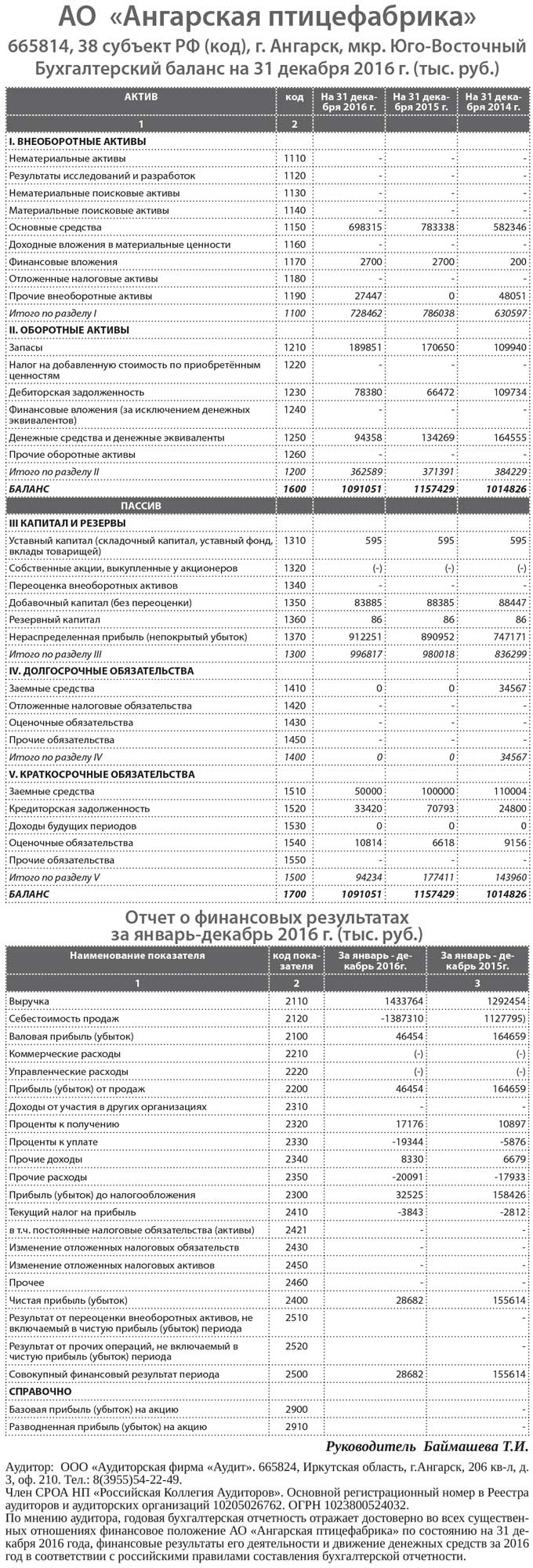 «Ангарская птицефабрика». Бухгалтерский баланс на 31 декабря 2016 г. (тыс. руб.)