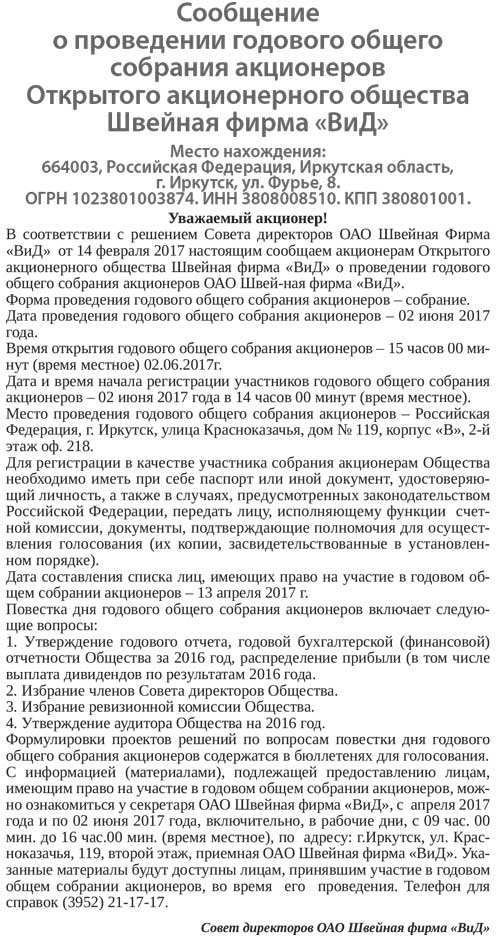 2 июня 2017 года состоится годовое общее собрание акционеров ОАО Швейная фирма «ВиД»