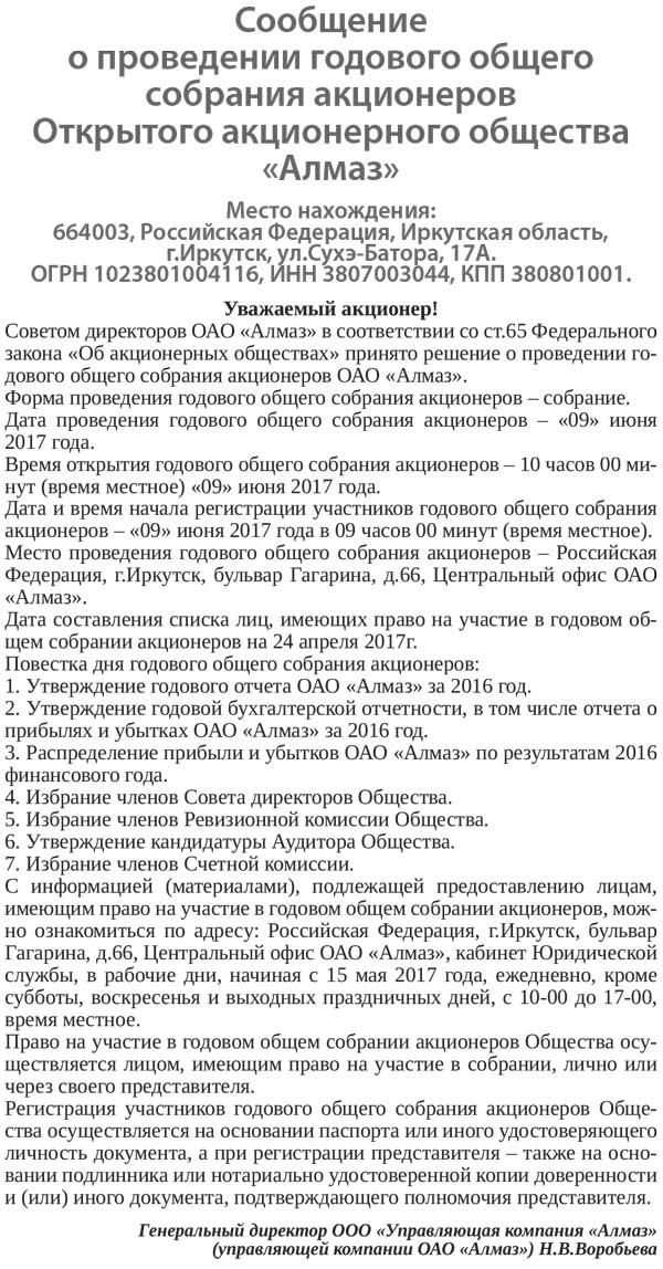 9 июня 2017 года состоится годовое общее собрание акционеров ОАО «Алмаз»