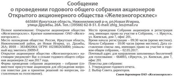 22 мая 2017 года состоится годовое общее собрание акционеров ОАО «Железногорсклес»