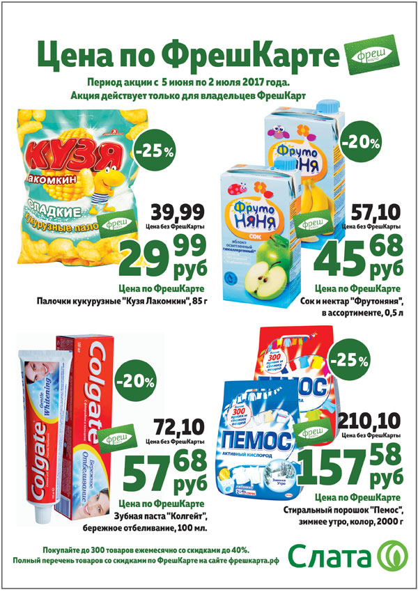 Супермаркет СЛАТА с 5 июня по 2 июля 2017г проводит акцию для держателей ФрешКарт